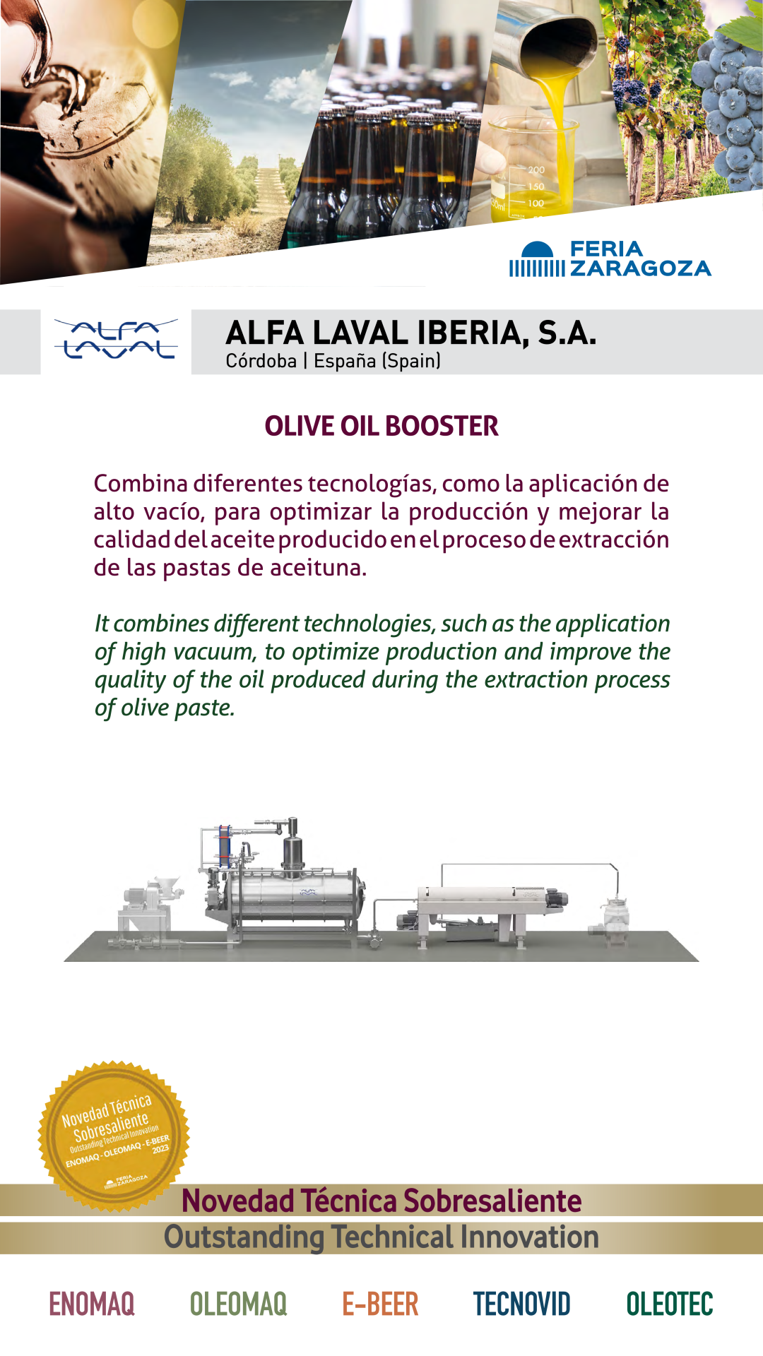 |  ALFA LAVAL IBERIA, S.A. |  ESPAÑA | OLIVE OIL BOOSTERCombina diferentes tecnologías, como la aplicación de alto vacío, para optimizar la producción y mejorar la calidad del aceite producido en el proceso de extracción de las pastas de aceituna. |