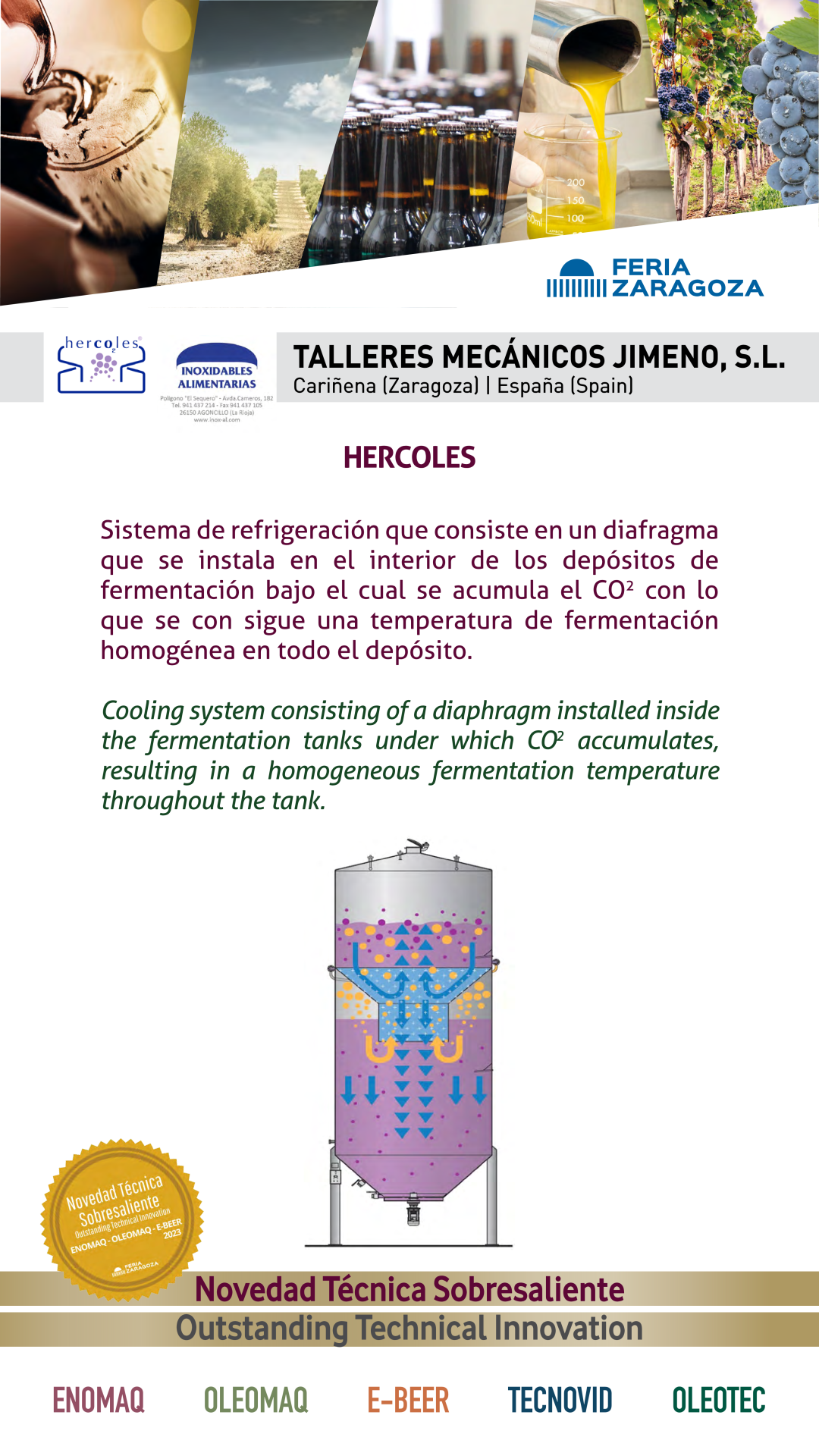 | Premio | Empresa | Procedencia | Producto |  |  TALLERES MECANICOS JIMENO, S.L. |  ESPAÑA | HERCOLESSistema de refrigeración que consiste en un diafragma que se instala en el interior de los depósitos de fermentación bajo el cual se acumula el CO2 con lo que se con sigue una temperatura de fermentación homogénea en todo el depósito. |