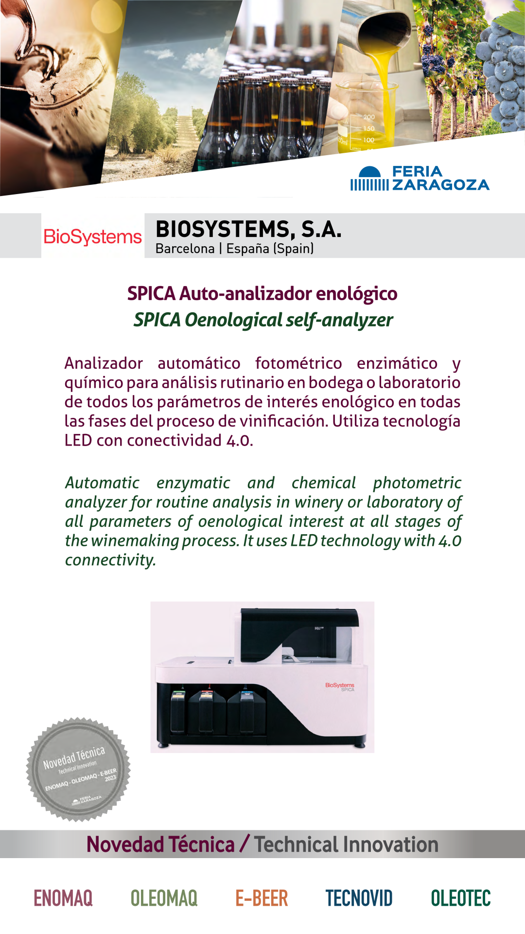 |  BIOSYSTEMS, S.A. |  ESPAÑA | Auto-analizador enológico SPICAAnalizador automático fotométrico enzimático y químico para análisis rutinario en bodega o laboratorio de todos los parámetros de interés enológico en todas las fases del proceso de vinificación. Utiliza tecnología LED con conectividad 4.0. |