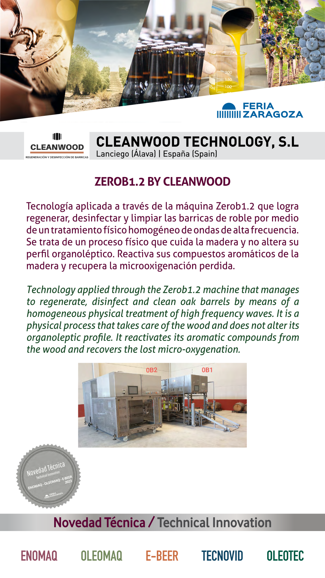 |  CLEANWOOD TECHNOLOGY, S.L. |  ESPAÑA | ZEROB1.2 BY CLEANWOODTecnología aplicada a través de la máquina Zerob1.2 que logra regenerar, desinfectar y limpiar las barricas de roble por medio de un tratamiento físico homogéneo de ondas de alta frecuencia. Se trata de un proceso físico que cuida la madera y no altera su perfil organoléptico. Reactiva sus compuestos aromáticos de la madera y recupera la microoxigenación perdida. |