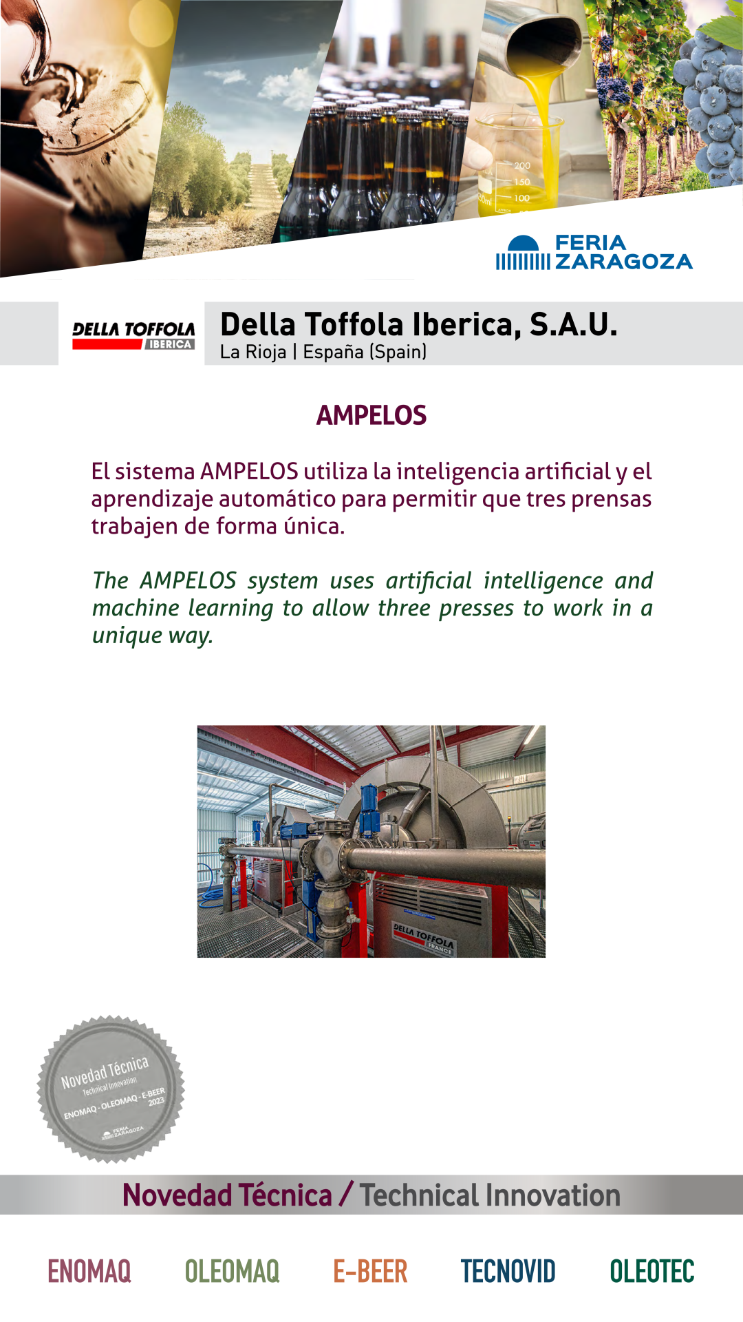 | Premio | Empresa | Procedencia | Producto |  |  DELLA TOFFOLA |  ESPAÑA | AMPELOSEl sistema AMPELOS utiliza la inteligencia artificial y el aprendizaje automático para permitir que tres prensas trabajen de forma única. |