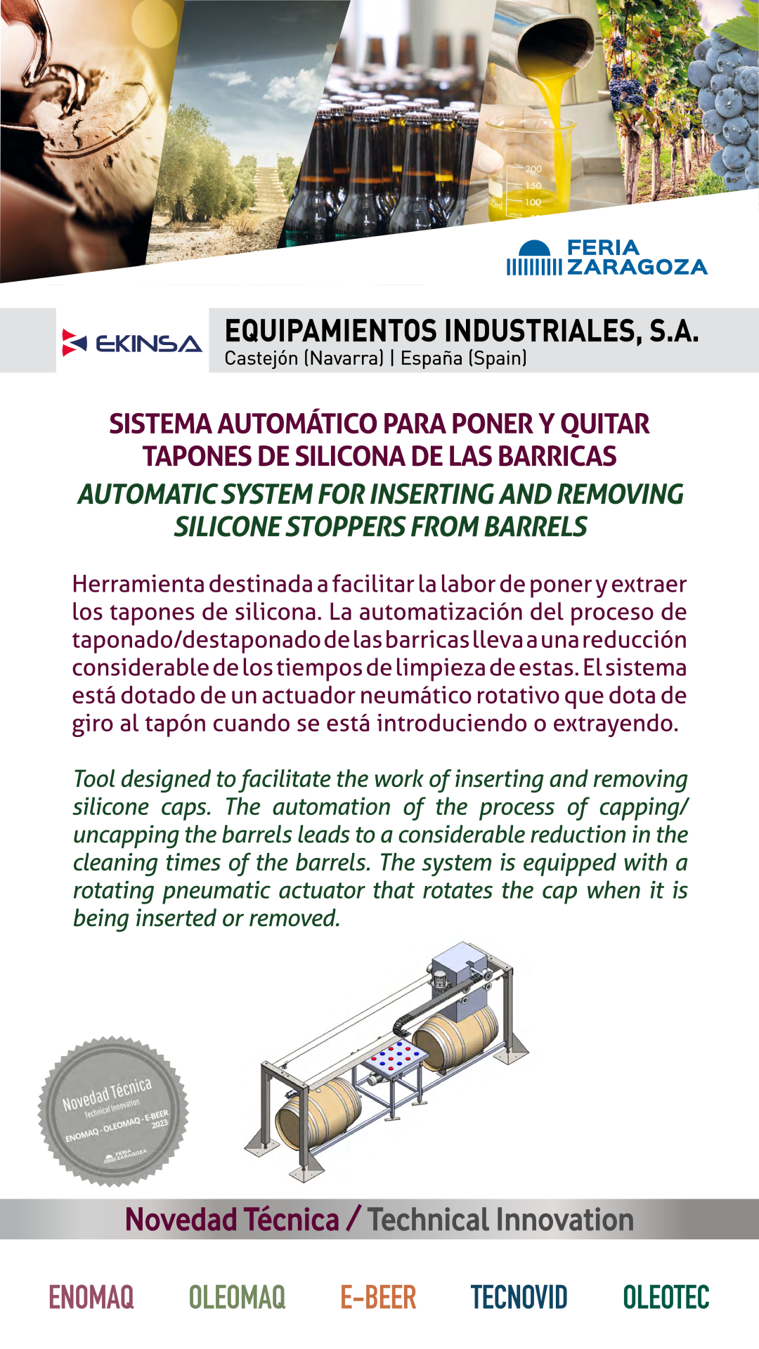 |  EKINSA |  ESPAÑA | SISTEMA AUTOMÁTICO PARA PONER Y QUITAR TAPONES DE SILICONA DE LAS BARRICASHerramienta destinada a facilitar la labor de poner y extraer los tapones de silicona. La automatización del proceso de taponado/destaponado de las barricas lleva a una reducción considerable de los tiempos de limpieza de estas. El sistema está dotado de un actuador neumático rotativo que dota de giro al tapón cuando se está introduciendo o extrayendo. |