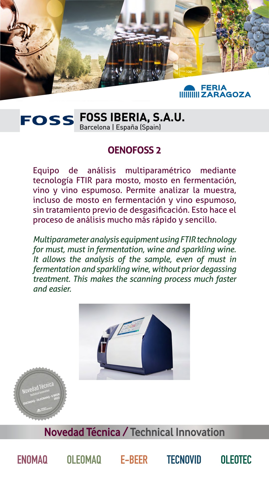 |  FOSS IBERIA, S.A.U. |  ESPAÑA | OENOFOSS 2Equipo de análisis multiparamétrico mediante tecnología FTIR para mosto, mosto en fermentación, vino y vino espumoso. Permite analizar la muestra, incluso de mosto en fermentación y vino espumoso, sin tratamiento previo de desgasificación. Esto hace el proceso de análisis mucho más rápido y sencillo. |