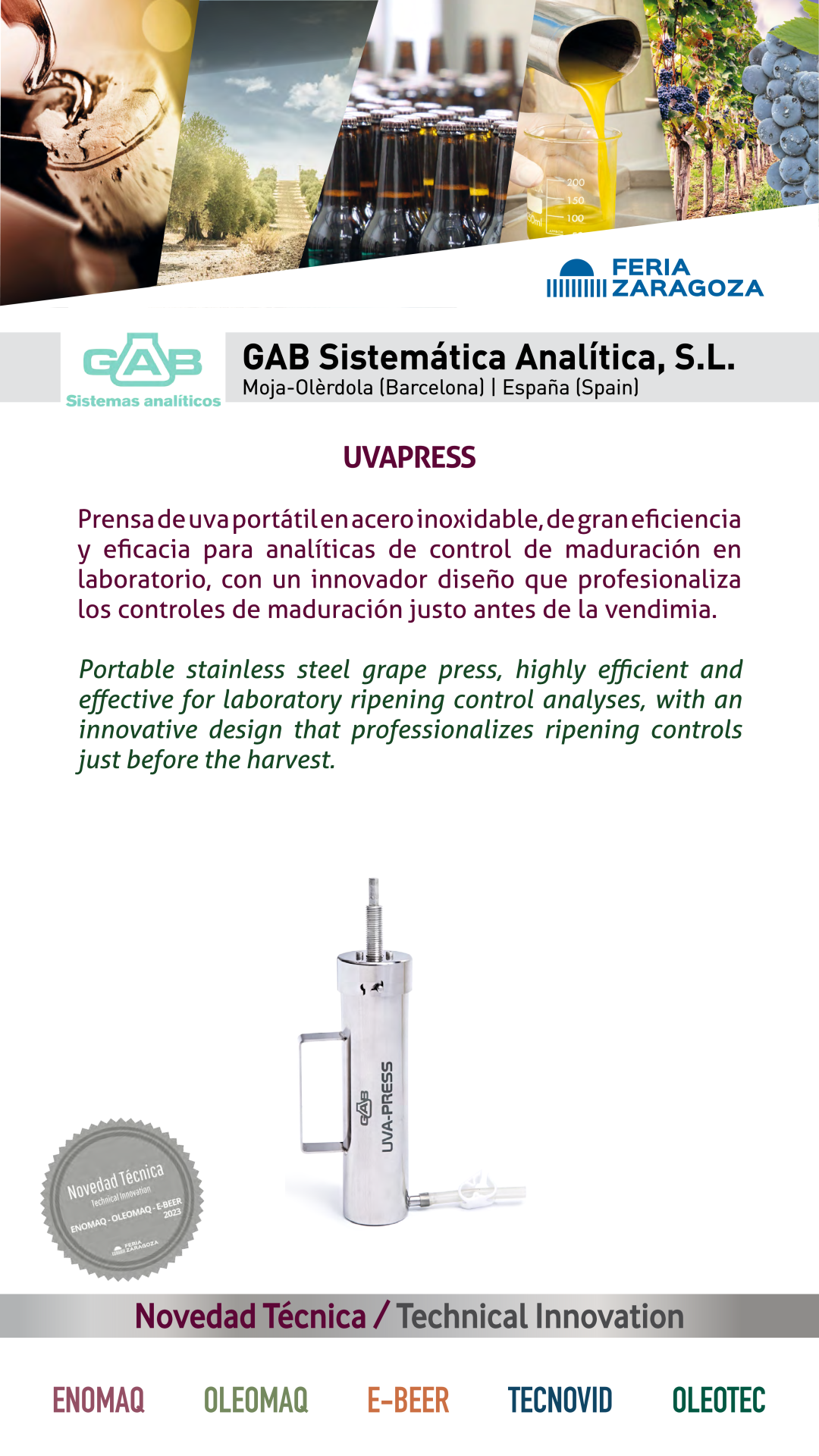 |  GAB SISTEMÁTICA ANALÍTICA, S.L. |  ESPAÑA | UVAPRESSPrensa de uva portátil en acero inoxidable, de gran eficiencia y eficacia para analíticas de control de maduración en laboratorio, con un innovador diseño que profesionaliza los controles de maduración justo antes de la vendimia. |