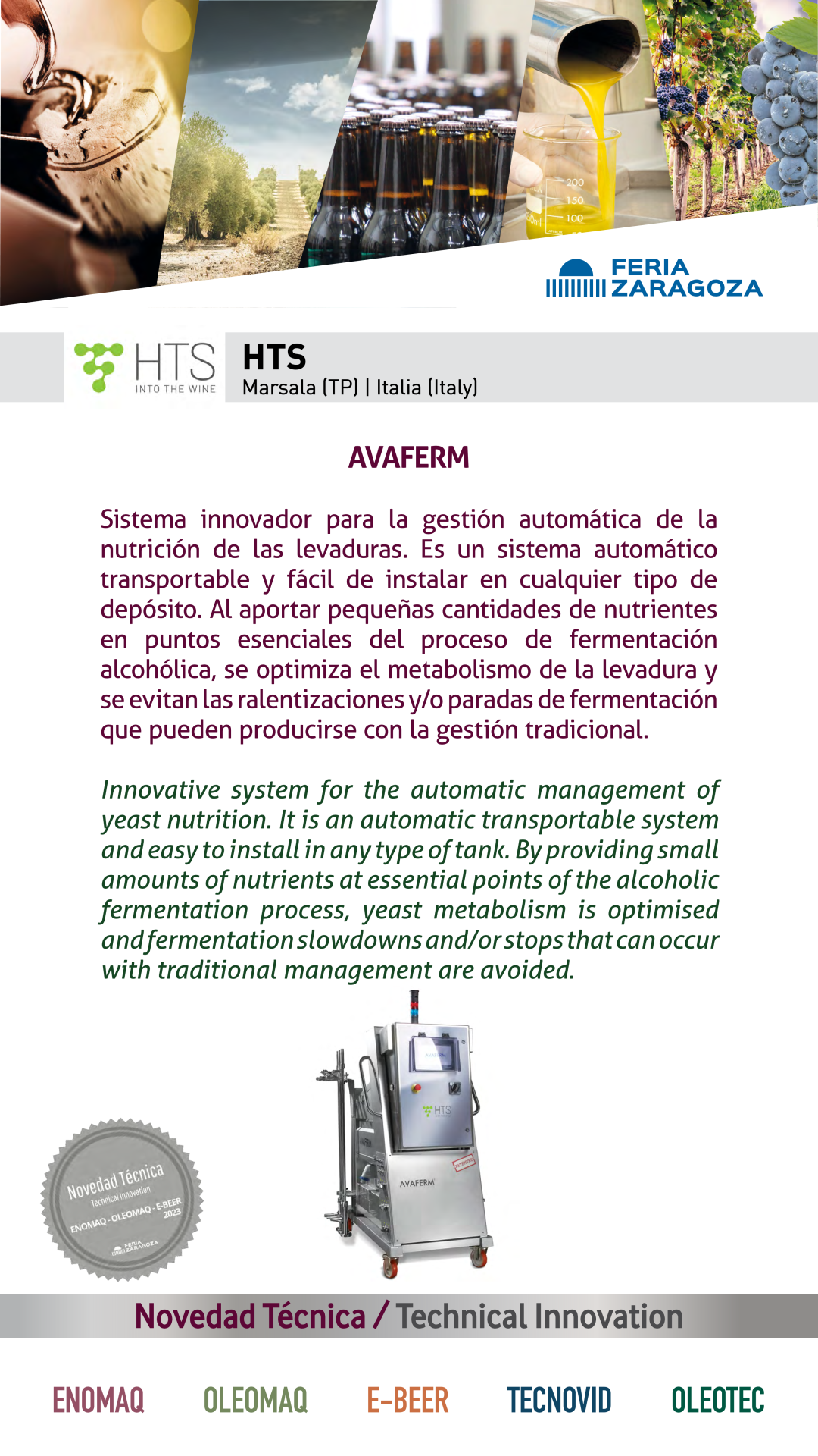 |  HTS |  ITALIA | AVAFERMSistema innovador para la gestión automática de la nutrición de las levaduras. Es un sistema automático transportable y fácil de instalar en cualquier tipo de depósito. Al aportar pequeñas cantidades de nutrientes en puntos esenciales del proceso de fermentación alcohólica, se optimiza el metabolismo de la levadura y se evitan las ralentizaciones y/o paradas de fermentación que pueden producirse con la gestión tradicional. |