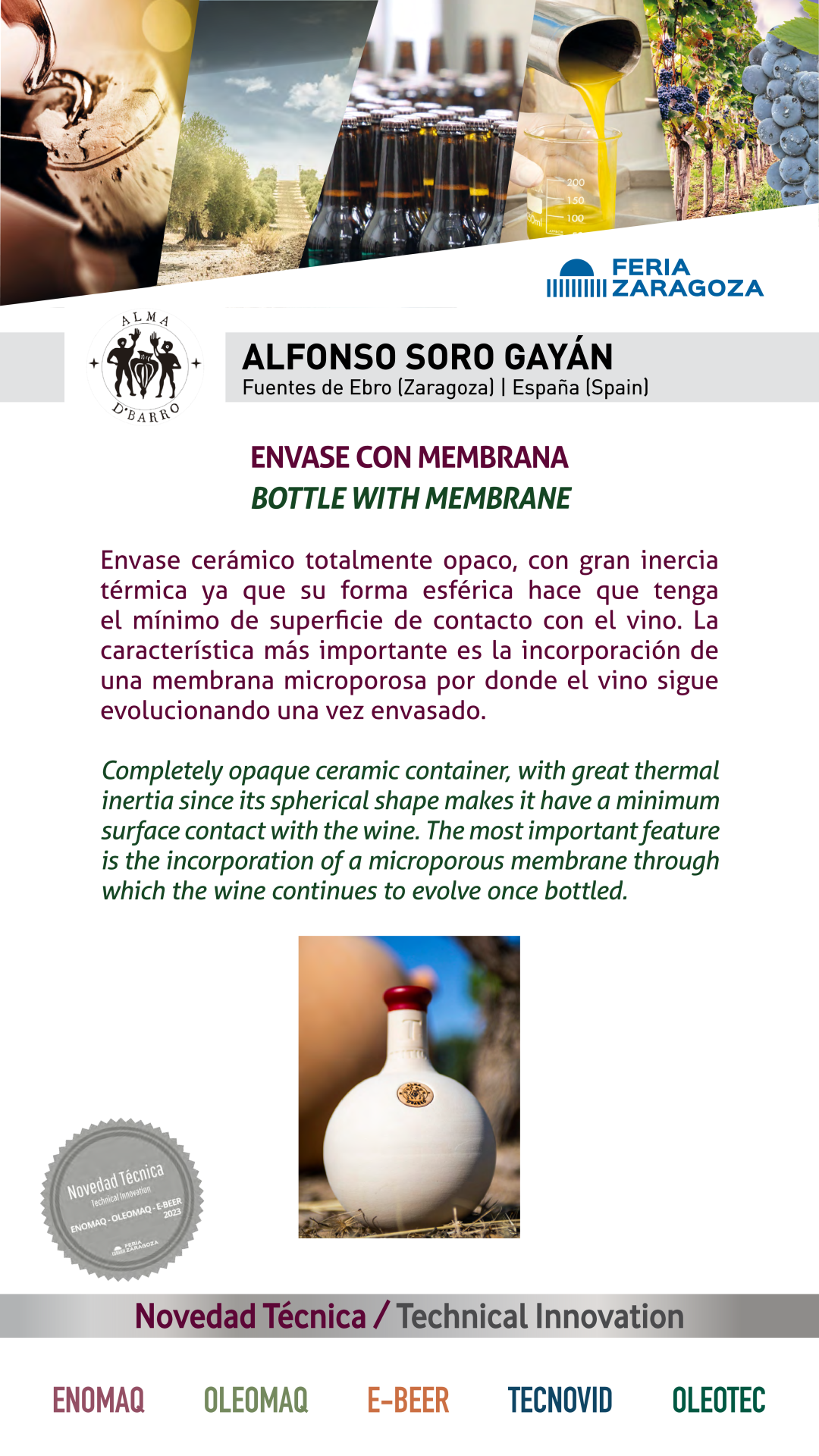 |  ALMA D' BARRO |  ESPAÑA | ENVASE CON MEMBRANAEnvase cerámico totalmente opaco, con gran inercia térmica ya que su forma esférica hace que tenga el mínimo de superficie de contacto con el vino. La característica más importante es la incorporación de una membrana microporosa por donde el vino sigue evolucionando una vez envasado. |