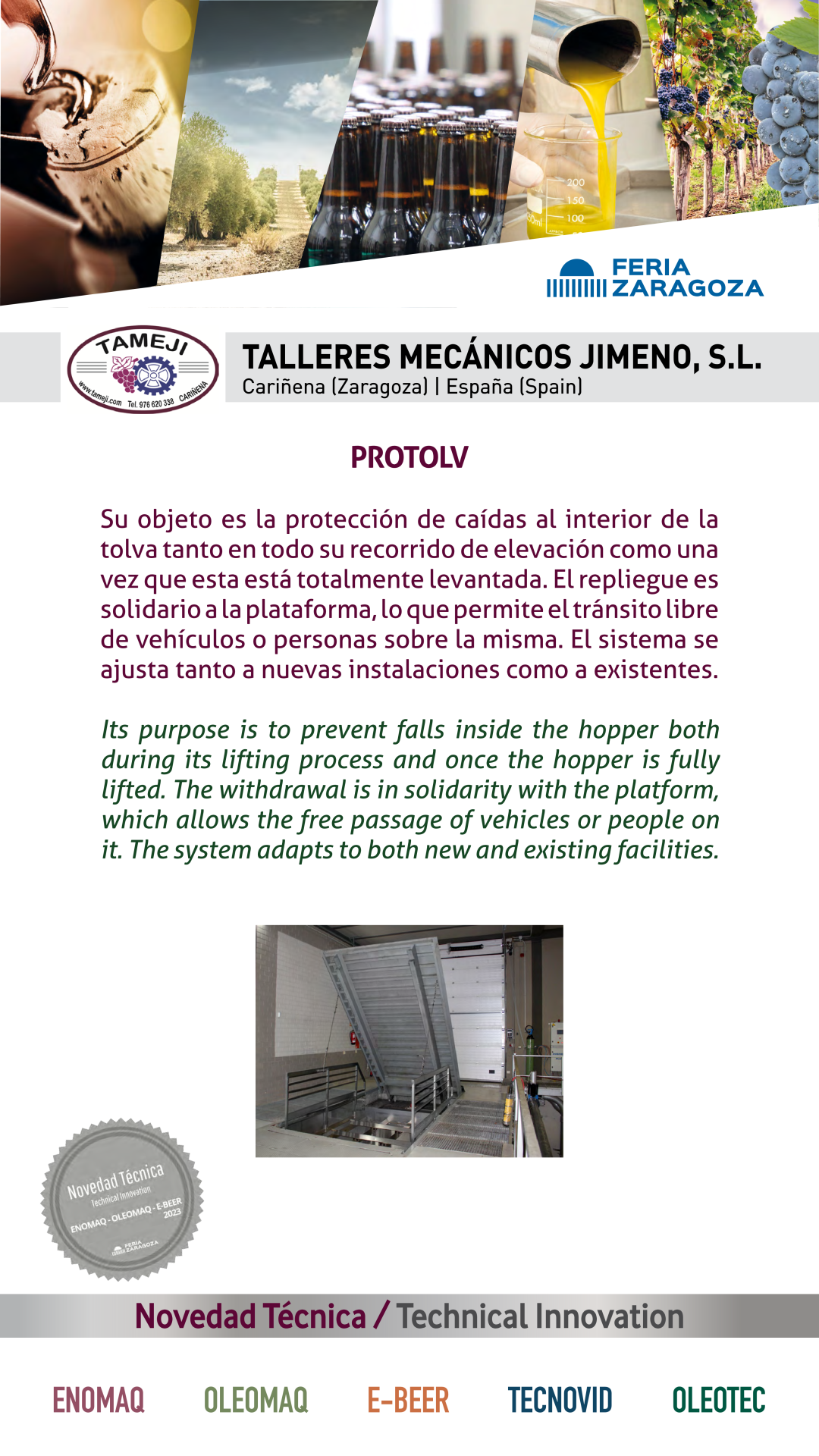 |  TALLERES MECANICOS JIMENO, S.L. |  ESPAÑA | PROTOLVSu objeto es la protección de caídas al interior de la tolva tanto en todo su recorrido de elevación como una vez que esta está totalmente levantada. El repliegue es solidario a la plataforma, lo que permite el tránsito libre de vehículos o personas sobre la misma. El sistema se ajusta tanto a nuevas instalaciones como a existentes. |