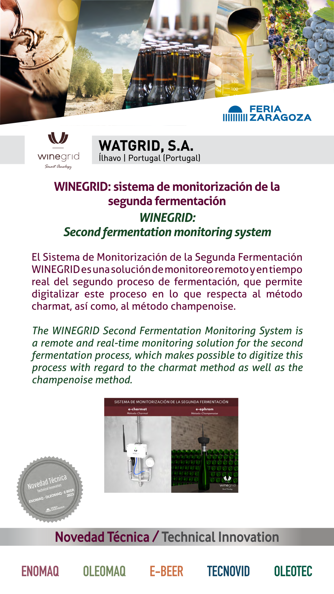 |  WATGRID, S.A. |  PORTUGAL | WINEGRID: sistema de monitorización de la segunda fermentaciónEl Sistema de Monitorización de la Segunda Fermentación WINEGRID es una solución de monitoreo remoto y en tiempo real del segundo proceso de fermentación, que permite digitalizar este proceso en lo que respecta al método charmat, así como, al método champenoise. |