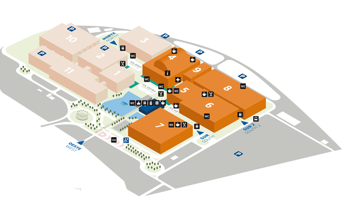Pulse sobre el pabellón deseado para ver el detalle de los expositores o sobre el edificio de congresos para ver el detalle de las salas de las jornadas técnicas.