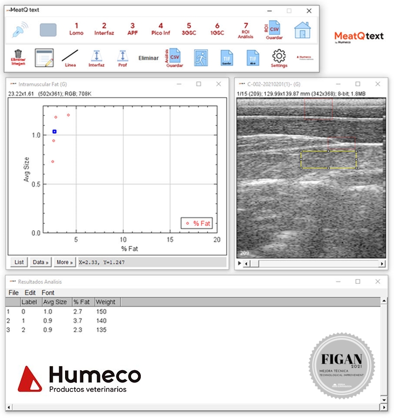 |  CONSORCIO MERCANTIL DE HUESCA, S.L. -HUMECO- |  ESPAÑA | MEATQ-TEXTSoftware que determina por ecografía porcentaje de grasa intramuscular infiltrada, en vivo en ganado vacuno y porcino. Mejora la precisión, la exactitud y la capacidad de predicción de las mediciones actuales. |