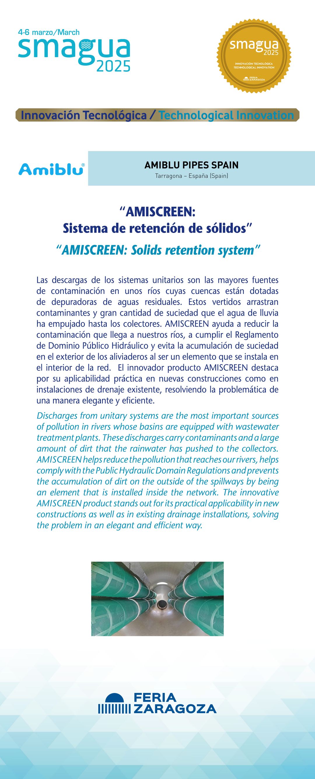 |  AMIBLU PIPES SPAIN |  España | AMISCREEN: Sistema de retención de sólidosLas descargas de los sistemas unitarios son las mayores fuentes de contaminación en unos ríos cuyas cuencas están dotadas de depuradoras de aguas residuales. Estos vertidos arrastran contaminantes y gran cantidad de suciedad que el agua de lluvia ha empujado hasta los colectores. AMISCREEN ayuda a reducir la contaminación que llega a nuestros ríos, a cumplir el Reglamento de Dominio Público Hidráulico y evita la acumulación de suciedad en el exterior de los aliviaderos al ser un elemento que se instala en el interior de la red. El innovador producto AMISCREEN destaca por su aplicabilidad práctica en nuevas construcciones como en instalaciones de drenaje existente, resolviendo la problemática de una manera elegante y eficiente. |