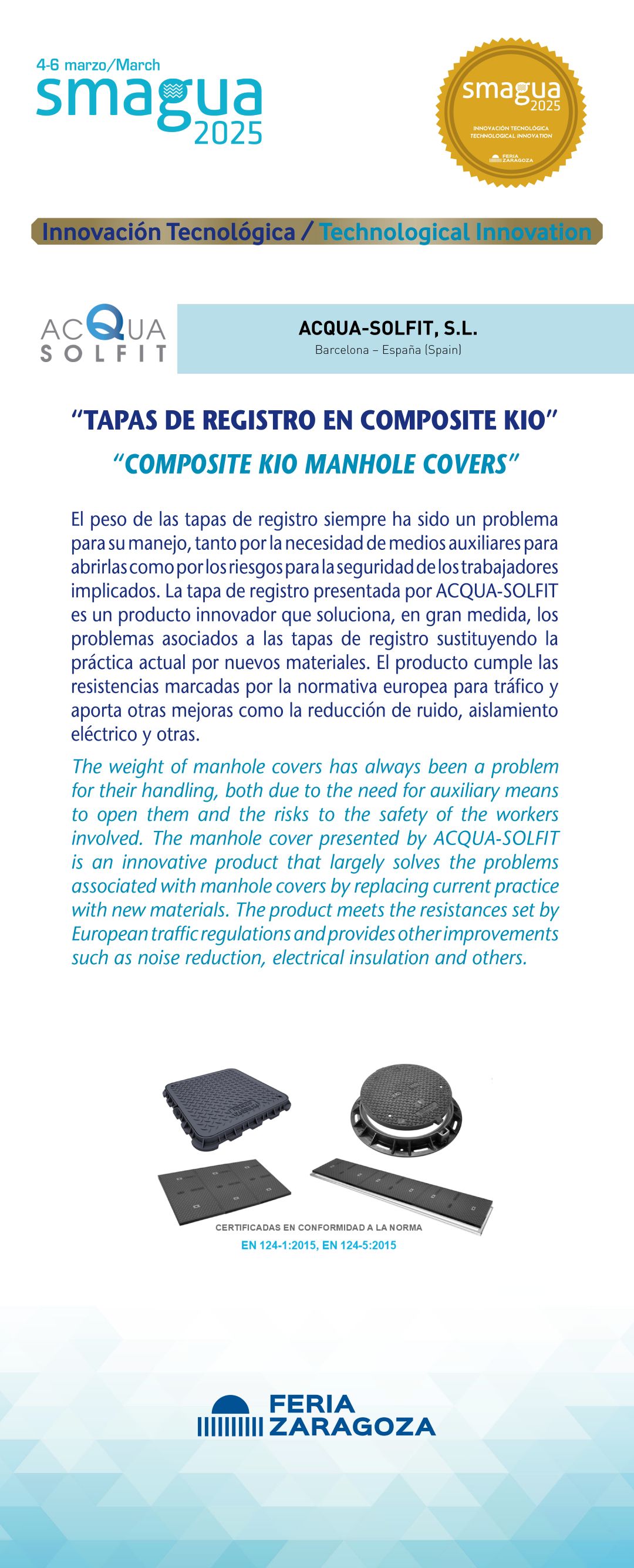|  ACQUA-SOLFIT, S.L. |  España | TAPAS DE REGISTRO EN COMPOSITE KIOEl peso de las tapas de registro siempre ha sido un problema para su manejo, tanto por la necesidad de medios auxiliares para abrirlas como por los riesgos para la seguridad de los trabajadores implicados. La tapa de registro presentada por ACQUA-SOLFIT es un producto innovador que soluciona, en gran medida, los problemas asociados a las tapas de registro sustituyendo la práctica actual por nuevos materiales. El producto cumple las resistencias marcadas por la normativa europea para tráfico y aporta otras mejoras como la reducción de ruido, aislamiento eléctrico y otras. |
