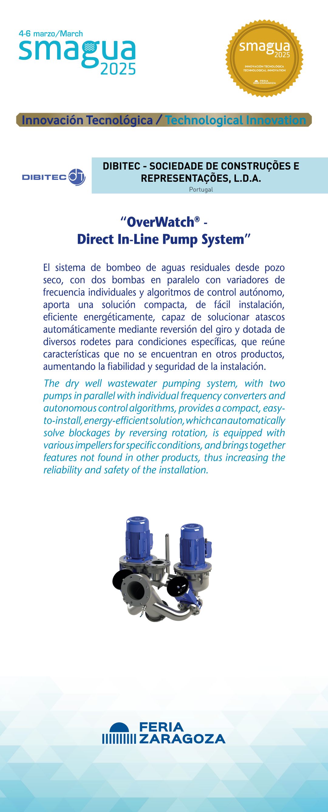 |  DIBITEC - SOCIEDADE DE CONSTRUÇÕES E REPRESENTAÇÕES, LDA |  Portugal | OverWatch® - Direct In-Line Pump SystemEl sistema de bombeo de aguas residuales desde pozo seco, con dos bombas en paralelo con variadores de frecuencia individuales y algoritmos de control autónomo, aporta una solución compacta, de fácil instalación, eficiente energéticamente, capaz de solucionar atascos automáticamente mediante reversión del giro y dotada de diversos rodetes para condiciones específicas, que reúne características que no se encuentran en otros productos, aumentando la fiabilidad y seguridad de la instalación. |