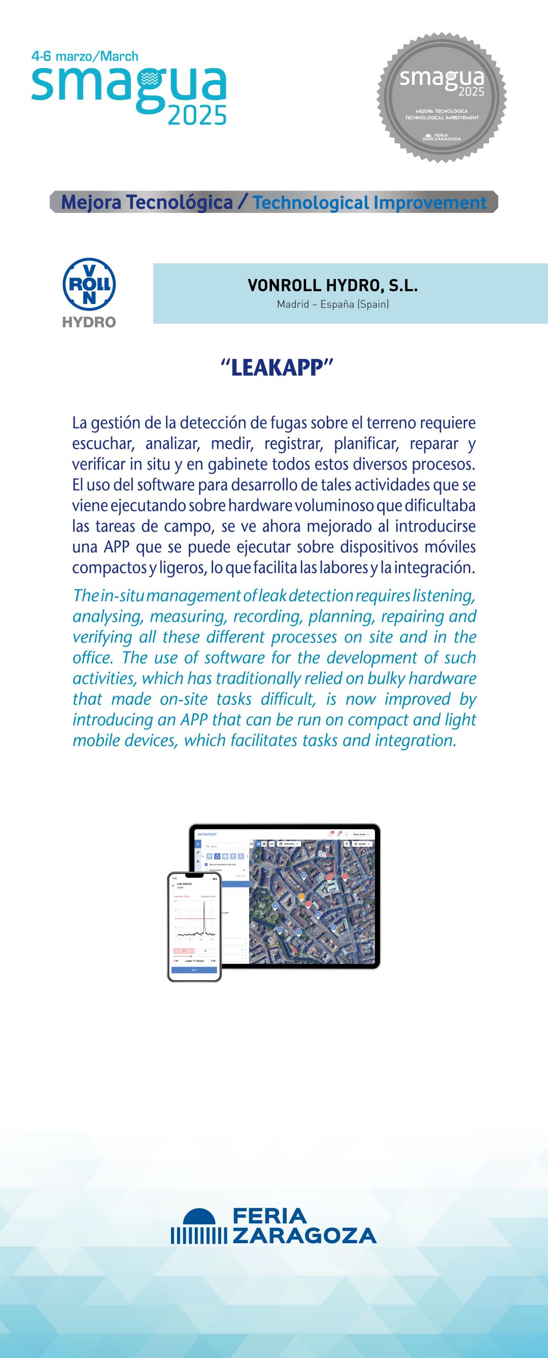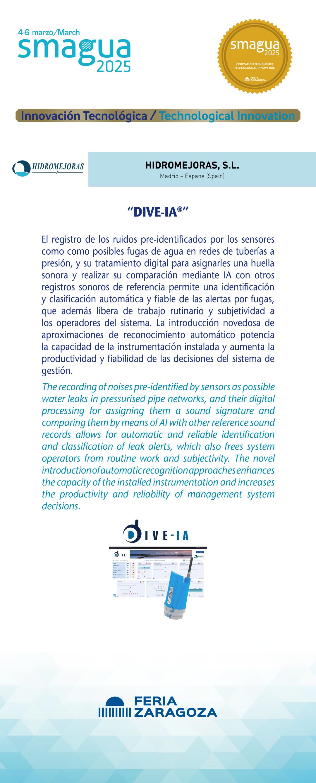|  HIDROMEJORAS, S.L. |  España | DIVE-IA®El registro de los ruidos pre-identificados por los sensores como como posibles fugas de agua en redes de tuberías a presión, y su tratamiento digital para asignarles una huella sonora y realizar su comparación mediante IA con otros registros sonoros de referencia permite una identificación y clasificación automática y fiable de las alertas por fugas, que además libera de trabajo rutinario y subjetividad a los operadores del sistema. La introducción novedosa de aproximaciones de reconocimiento automático potencia la capacidad de la instrumentación instalada y aumenta la productividad y fiabilidad de las decisiones del sistema de gestión. |