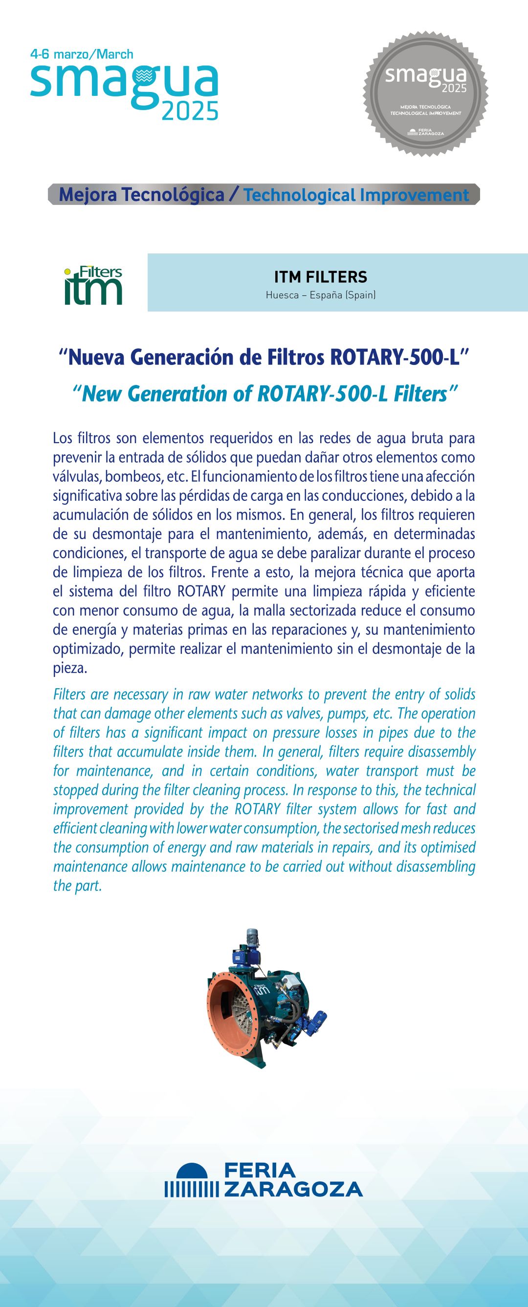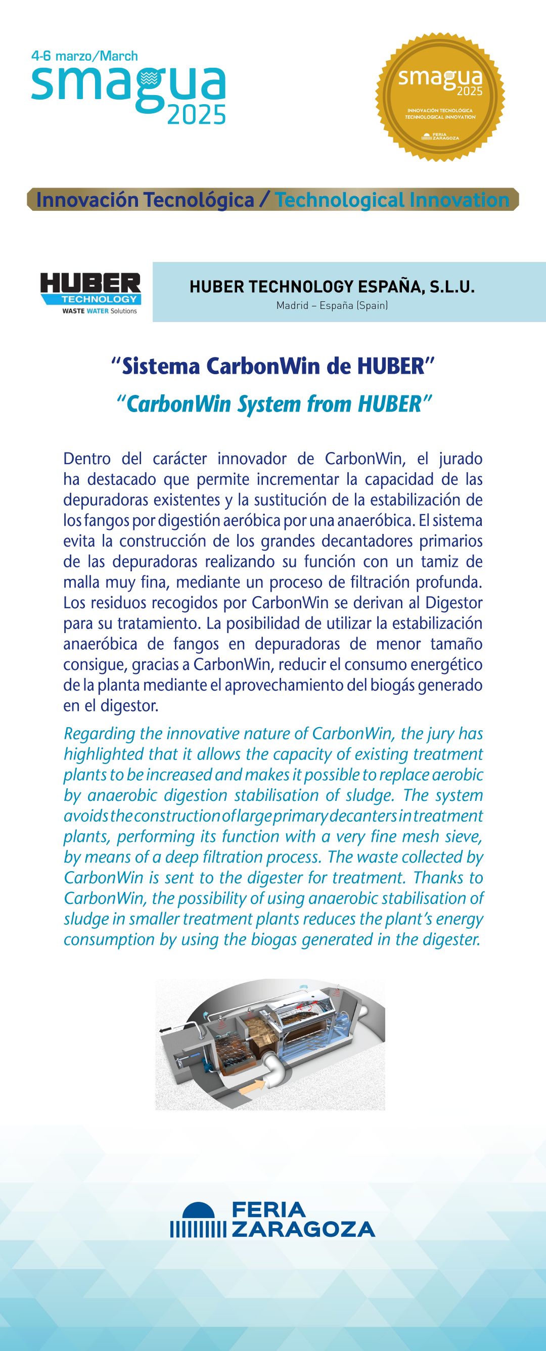 |  HUBER TECHNOLOGY ESPAÑA S.L.U |  España | Sistema CarbonWin de HUBERDentro del carácter innovador de CarbonWin, el jurado ha destacado que permite incrementar la capacidad de las depuradoras existentes y la sustitución de la estabilización de los fangos por digestión aeróbica por una anaeróbica. El sistema evita la construcción de los grandes decantadores primarios de las depuradoras realizando su función con un tamiz de malla muy fina, mediante un proceso de filtración profunda. Los residuos recogidos por CarbonWin se derivan al Digestor para su tratamiento. La posibilidad de utilizar la estabilización anaeróbica de fangos en depuradoras de menor tamaño consigue, gracias a CarbonWin, reducir el consumo energético de la planta mediante el aprovechamiento del biogás generado en el digestor. |