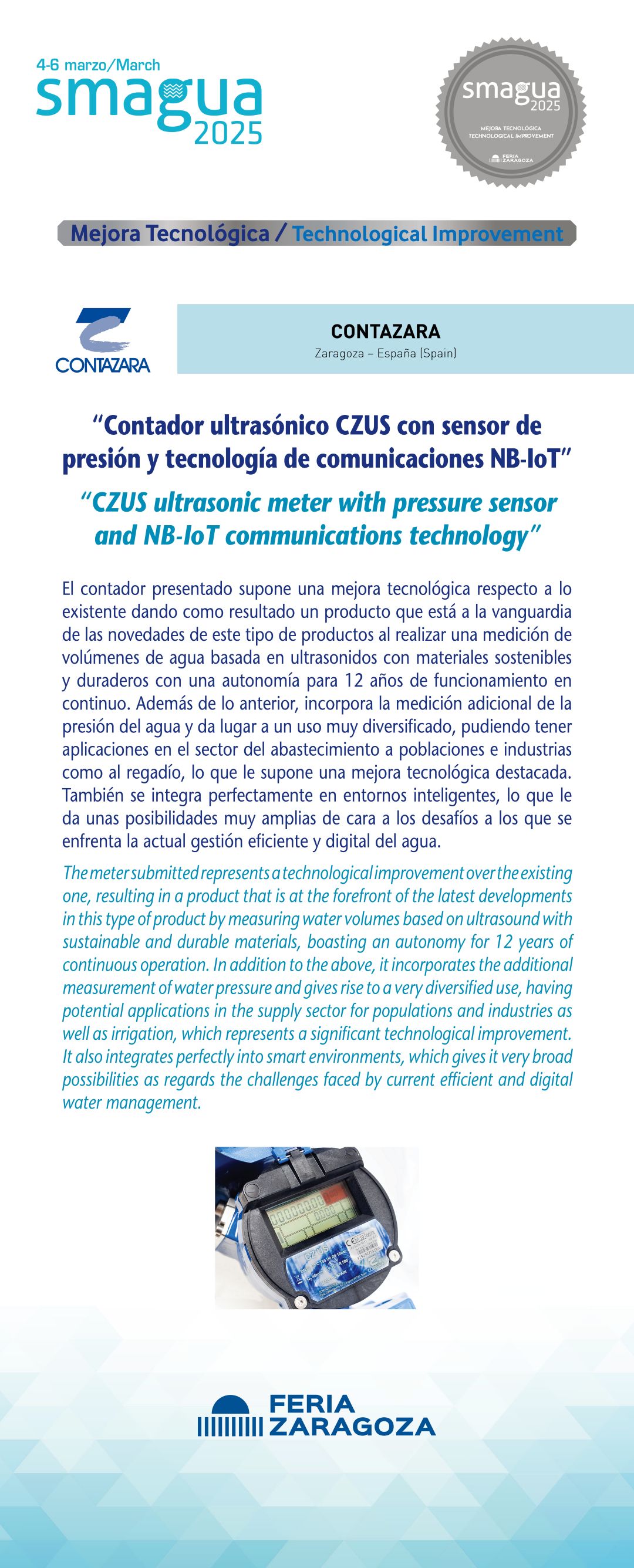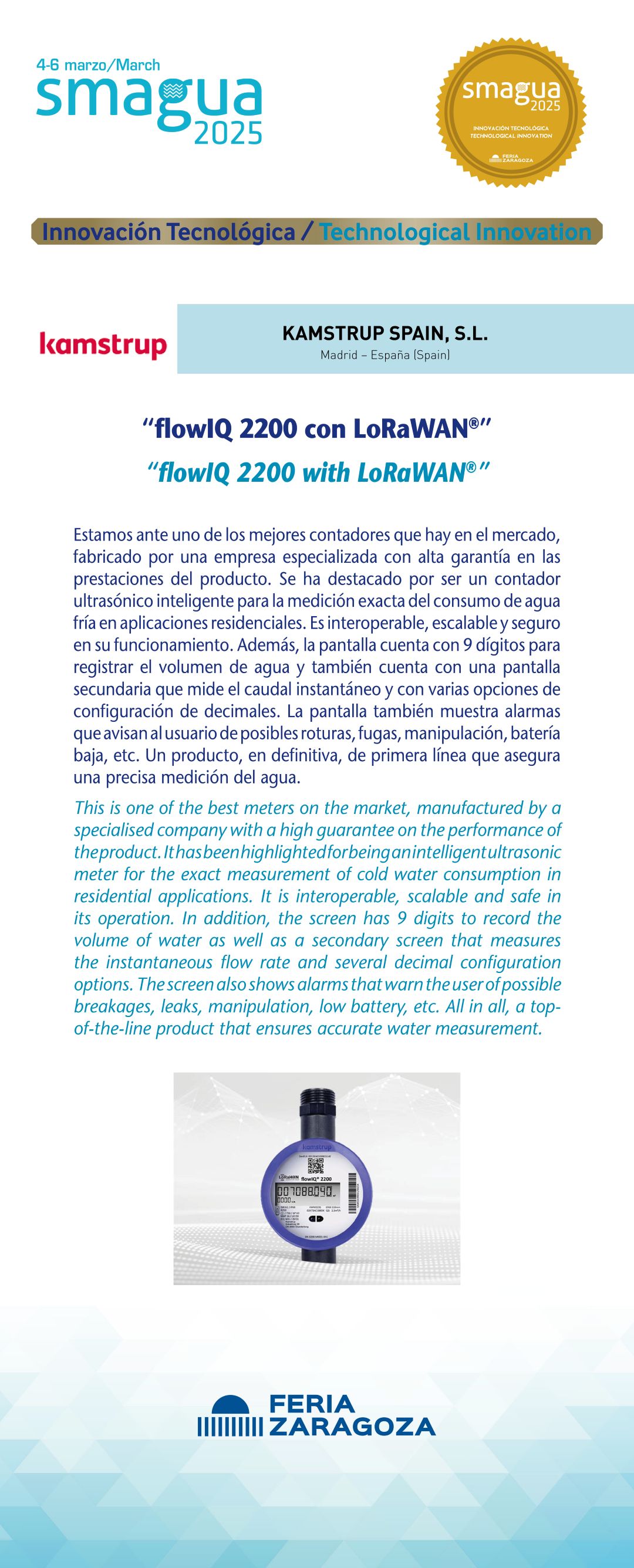 |  KAMSTRUP SPAIN, S.L. |  España | flowIQ 2200 con LoRaWAN®Estamos ante uno de los mejores contadores que hay en el mercado, fabricado por una empresa especializada con alta garantía en las prestaciones del producto. Se ha destacado por ser un contador ultrasónico inteligente para la medición exacta del consumo de agua fría en aplicaciones residenciales. Es interoperable, escalable y seguro en su funcionamiento. Además, la pantalla cuenta con 9 dígitos para registrar el volumen de agua y también cuenta con una pantalla secundaria que mide el caudal instantáneo y con varias opciones de configuración de decimales. La pantalla también muestra alarmas que avisan al usuario de posibles roturas, fugas, manipulación, batería baja, etc. Un producto, en definitiva, de primera línea que asegura una precisa medición del agua. |