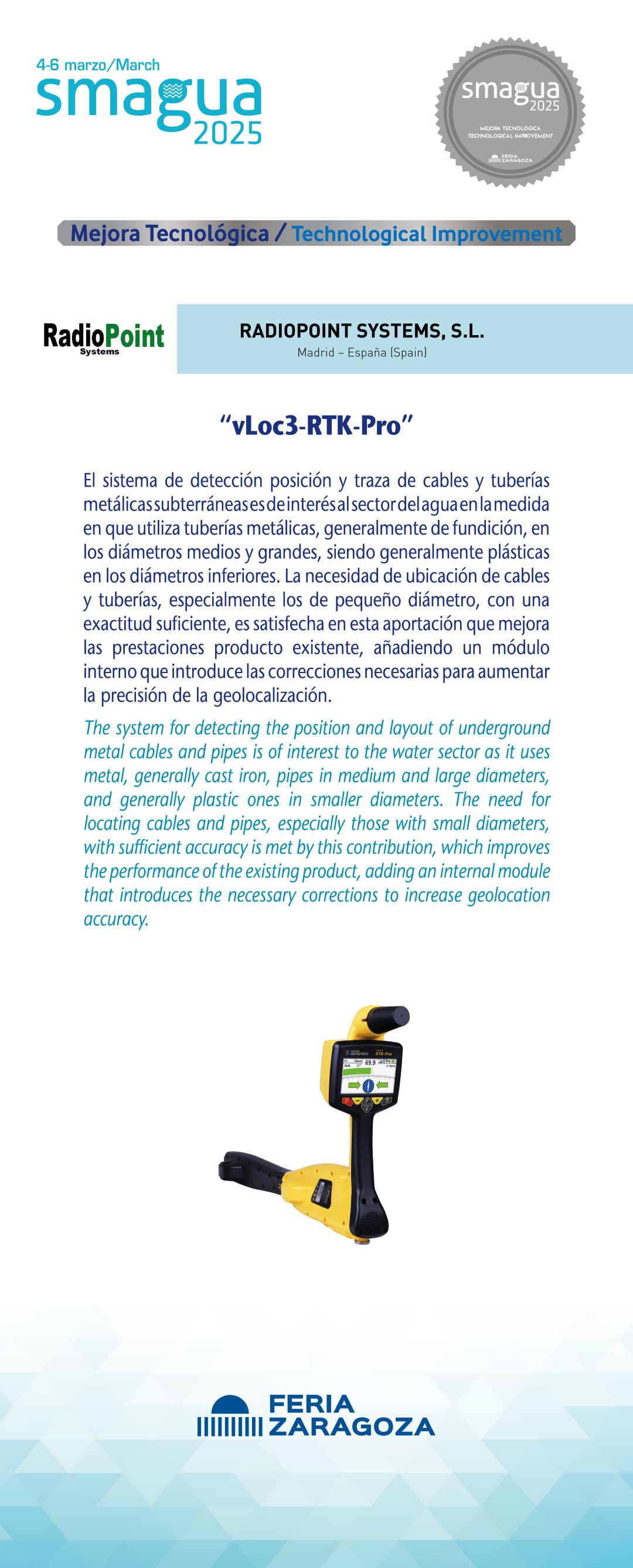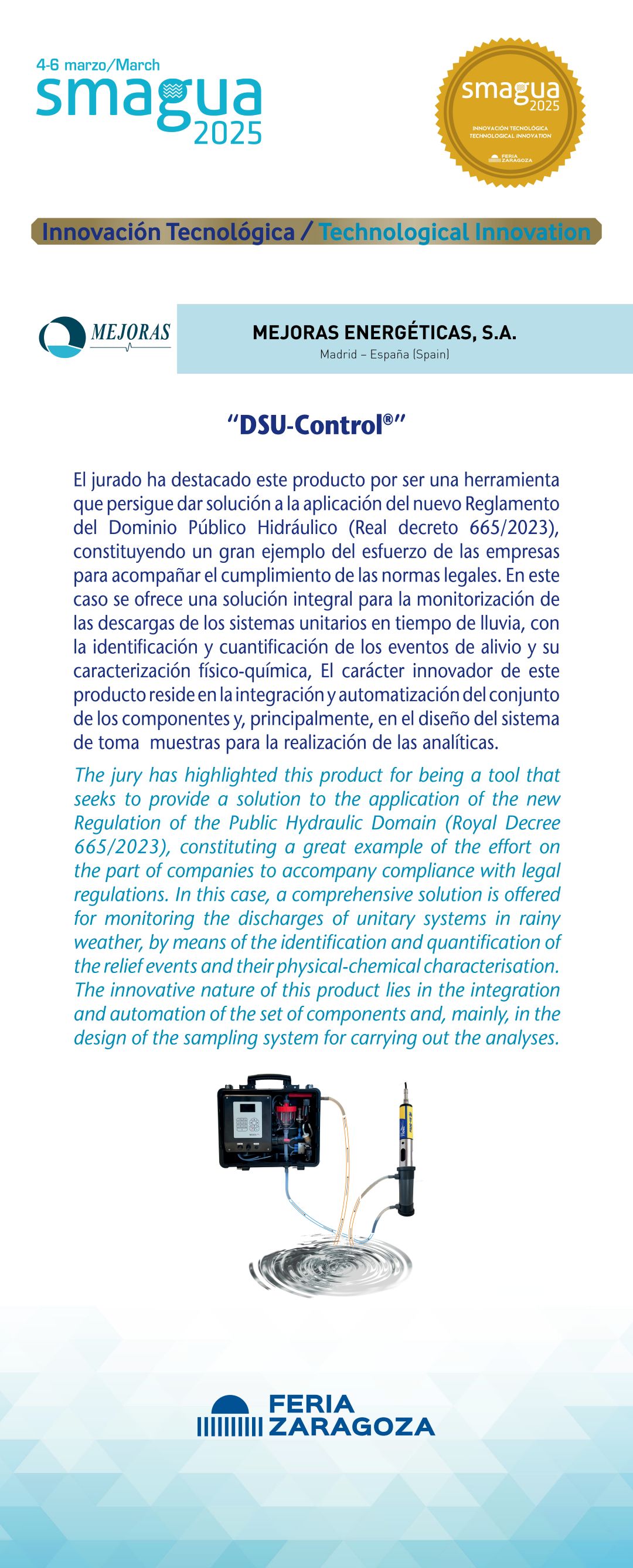 |  MEJORAS ENERGÉTICAS, S.A. |  España | DSU-Control®El jurado ha destacado este producto por ser una herramienta que persigue dar solución a la aplicación del nuevo Reglamento del Dominio Público Hidráulico (Real decreto 665/2023), constituyendo un gran ejemplo del esfuerzo de las empresas para acompañar el cumplimiento de las normas legales. En este caso se ofrece una solución integral para la monitorización de las descargas de los sistemas unitarios en tiempo de lluvia, con la identificación y cuantificación de los eventos de alivio y su caracterización físico-química, El carácter innovador de este producto reside en la integración y automatización del conjunto de los componentes y, principalmente, en el diseño del sistema de tomamuestras para la realización de las analíticas. |
