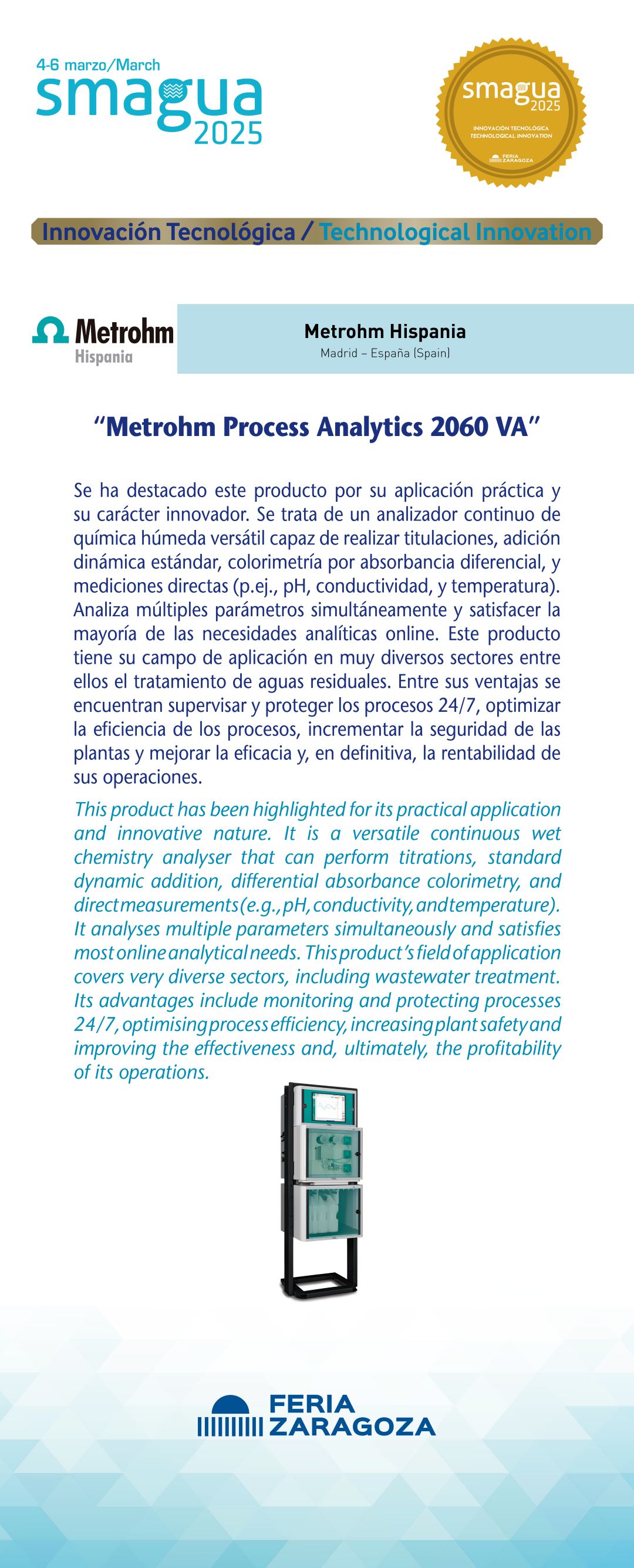 |  Metrohm Hispania |  España | Metrohm Process Analytics 2060 VASe ha destacado este producto por su aplicación práctica y su carácter innovador. Se trata de un analizador continuo de química húmeda versátil capaz de realizar titulaciones, adición dinámica estándar, colorimetría por absorbancia diferencial, y mediciones directas (p.ej., pH, conductividad, y temperatura). Analiza múltiples parámetros simultáneamente y satisfacer la mayoría de las necesidades analíticas online. Este producto tiene su campo de aplicación en muy diversos sectores entre ellos el tratamiento de aguas residuales. Entre sus ventajas se encuentran supervisar y proteger los procesos 24/7, optimizar la eficiencia de los procesos, incrementar la seguridad de las plantas y mejorar la eficacia y, en definitiva, la rentabilidad de sus operaciones. |
