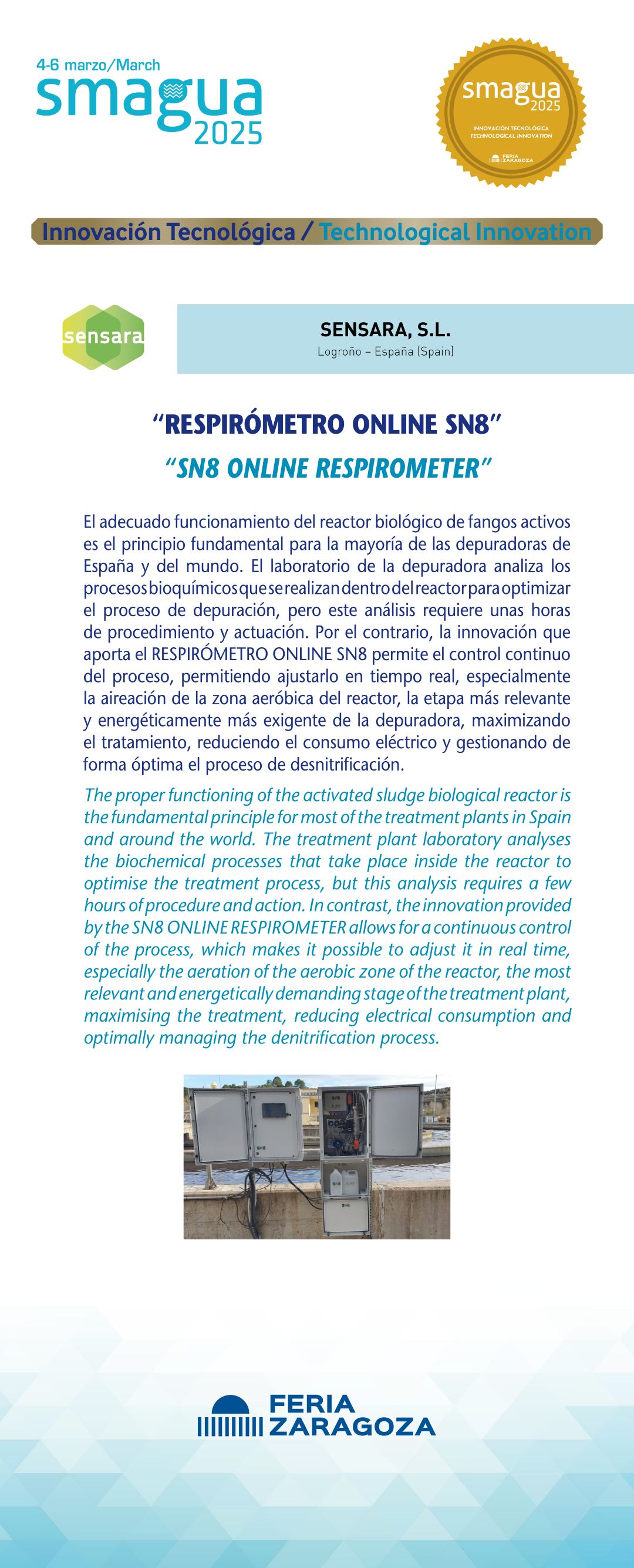 |  SENSARA, S.L. |  España | RESPIRÓMETRO ONLINE SN8El adecuado funcionamiento del reactor biológico de fangos activos es el principio fundamental para la mayoría de las depuradoras de España y del mundo. El laboratorio de la depuradora analiza los procesos bioquímicos que se realizan dentro del reactor para optimizar el proceso de depuración, pero este análisis requiere unas horas de procedimiento y actuación. Por el contrario, la innovación que aporta el RESPIRÓMETRO ONLINE SN8 permite el control continuo del proceso, permitiendo ajustarlo en tiempo real, especialmente la aireación de la zona aeróbica del reactor, la etapa más relevante y energéticamente más exigente de la depuradora, maximizando el tratamiento, reduciendo el consumo eléctrico y gestionando de forma óptima el proceso de desnitrificación. |